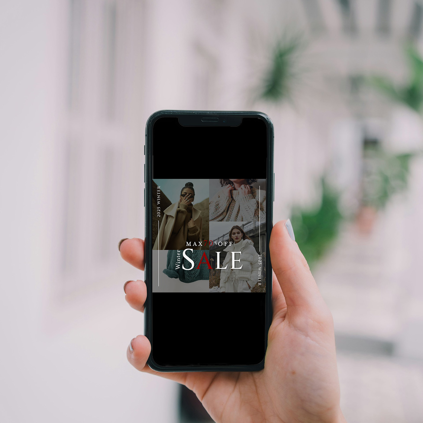 「世界観を崩さず、セールを印象づける」をコンセプトに、ブランドイメージを保ちながら割引情報を直感的に伝えるアパレル向けセールバナーを制作しました。複数ビジュアルを用いた構成で商品ラインナップを想起させ、MAX70%OFFを視線の中心に配置することで、購買意欲を高めつつ上質な印象を維持するデザインとしています。