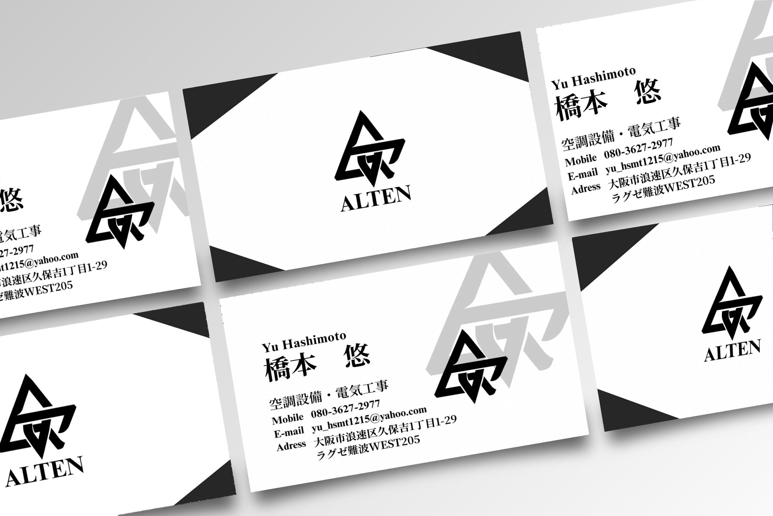 空調設備・電気工事を行うALTEN様の名刺デザインを担当。「統一感と信頼感のある第一印象」をコンセプトに、ロゴを主役にしたシンプルな構成と余白設計で、初対面でも業種と印象が自然に伝わるデザインに仕上げました。